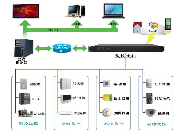 機房動力環(huán)境監(jiān)測控制系統(tǒng)采用“集中管理、分散控制”的模式,即各機房現(xiàn)場的設備環(huán)境系統(tǒng)將數據傳輸到在本地監(jiān)控主機,同時監(jiān)控主機通過數據網絡將數據傳輸至總部監(jiān)控管理中心,由監(jiān)控中心管理服務器實現(xiàn)對分布在不同區(qū)域的網絡監(jiān)測機房的集中管理。
