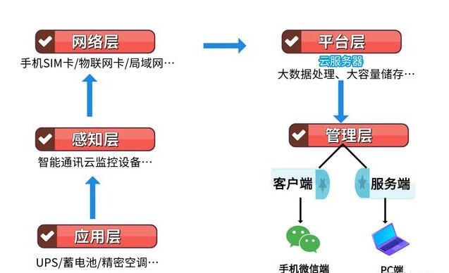 我們多次提到動(dòng)環(huán)監(jiān)控方案是由溫濕度模塊、電力監(jiān)控模塊、漏水檢測模塊、安防監(jiān)控模塊、網(wǎng)絡(luò)監(jiān)控模塊等組成的綜合性監(jiān)控系統(tǒng)。那么這次我們來聊聊動(dòng)環(huán)監(jiān)控方案的基本結(jié)構(gòu)。 從基本結(jié)構(gòu)上來講,動(dòng)環(huán)監(jiān)控方案可以由三部分組成,分別是:信息感知層(前端監(jiān)控)、網(wǎng)絡(luò)通信傳輸層(無線傳輸部分)、應(yīng)用服務(wù)層(后臺管理中心)三部分成。 一、信息感知層(前端監(jiān)控) 信息感知層(前端監(jiān)控)主要由物聯(lián)網(wǎng)設(shè)備組成,因此它又稱為物聯(lián)網(wǎng)設(shè)備端。根據(jù)應(yīng)用場景的不同,感知層搭載的設(shè)備是多種多樣的,包括溫濕度監(jiān)控模塊、漏水監(jiān)控模塊、ups監(jiān)控模塊、發(fā)電機(jī)監(jiān)控模塊、空調(diào)監(jiān)控模塊、門禁監(jiān)控模塊、防盜監(jiān)控模塊、消防監(jiān)控模塊等。主要復(fù)雜前端信息的采集,最主要的性能就是數(shù)據(jù)采集,采集的信息包括環(huán)境信息、性能信息、異常信息和業(yè)務(wù)信息。 二、網(wǎng)絡(luò)通信傳輸層(無線傳輸部分) 網(wǎng)絡(luò)通信傳輸層(無線傳輸部分)是整個(gè)網(wǎng)絡(luò)體系結(jié)構(gòu)中的關(guān)鍵層次之一,主要負(fù)責(zé)向兩個(gè)主機(jī)中進(jìn)程之間的通信提供服務(wù)。信息感知層(前端監(jiān)控)將溫濕度監(jiān)控模塊、漏水監(jiān)控模塊、ups監(jiān)控模塊、發(fā)電機(jī)監(jiān)控模塊、空調(diào)監(jiān)控模塊、門禁監(jiān)控模塊、防盜監(jiān)控模塊、消防監(jiān)控模塊等采集到的信息傳輸?shù)骄W(wǎng)絡(luò)通信傳輸層,而網(wǎng)絡(luò)通信傳輸層作為橋梁將信息傳輸?shù)胶笈_管理中心,并對這些信息進(jìn)行集中監(jiān)控與管理。 三、應(yīng)用服務(wù)層(后臺管理中心) 應(yīng)用服務(wù)層(后臺管理中心)的主要作用是接收、處理網(wǎng)絡(luò)通信傳輸層傳來的各項(xiàng)數(shù)據(jù),同時(shí)通過后臺大屏、手機(jī)端、PC端對數(shù)據(jù)進(jìn)行觀察、判斷,并對出現(xiàn)的異常進(jìn)行報(bào)警。 動(dòng)環(huán)監(jiān)控解決方案依靠這三大部分完成系統(tǒng)的采集、分析、傳輸、監(jiān)控和管理,完成機(jī)房、圖書館、博物館等的24小時(shí)無人值守下安全、穩(wěn)定、持續(xù)運(yùn)行。