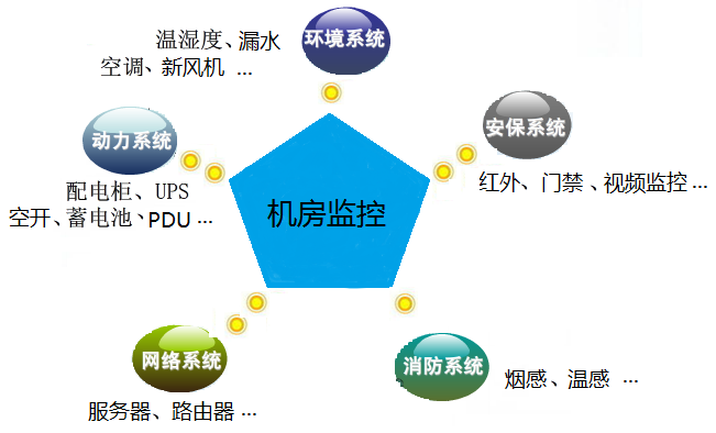 機(jī)房監(jiān)控系統(tǒng)主要是將機(jī)房的動(dòng)力系統(tǒng)、環(huán)境系統(tǒng)、消防系統(tǒng)、保安系統(tǒng)、網(wǎng)絡(luò)系統(tǒng)等進(jìn)行統(tǒng)一集中監(jiān)控管理,最終實(shí)現(xiàn)一體化。